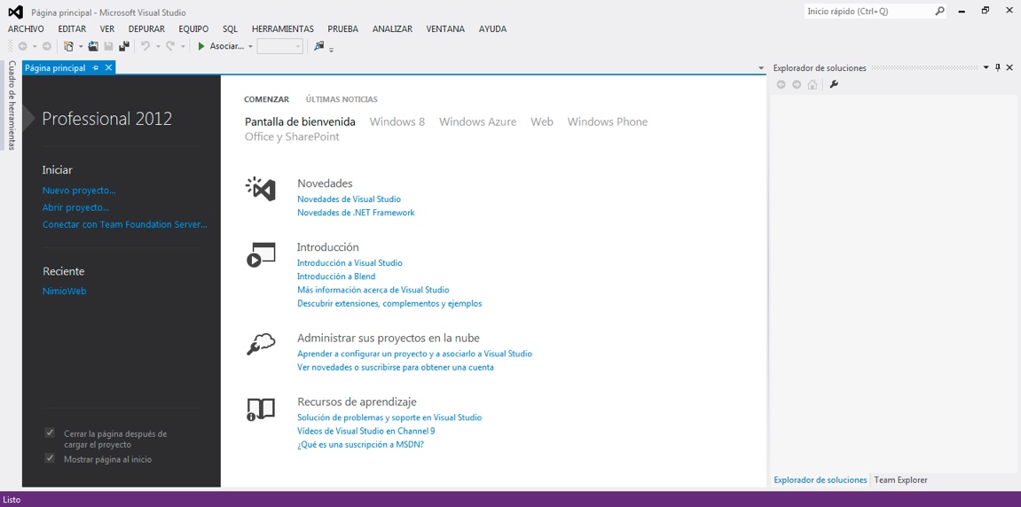 Aquí van capturas de las páginas de inicio de las versiones de Visual Studio 2008, 2010 y 2012, esta última en aspecto claro y en aspecto oscuro, modo que de momento me gusta más. En orden cronológico, lo que resulta de rigor en estos casos.