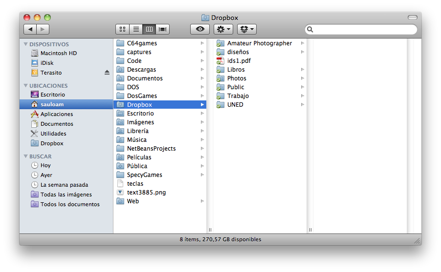 Hasta hace poco era una herramienta de uso diario. Cargaba todos los días con mi portátil y ya no necesitaba llevar documentación en un pen de aquí para allá. Todo estaba en la nube, en mi disco duro virtual Dropbox. Cualquier cambio que realizaba en el documento automáticamente se sincronizaba con el ordenador de sobremesa. Con el cliente instalado en el sistema operativo el servicio Dropbox aparece como otra carpeta más dentro de la jerarquía de directorios del propio sistema. Meter y sacar cosas en la carpeta Dropbox es tan sencillo como arrastrar y soltar en el Finder, si tienes Mac, o en el explorador de archivos, si eres de Windows. Mientras estás haciendo cualquier otra cosa, el servicio ya se encarga de sincronizar lo que tenga que subir o bajar a o desde la nube.