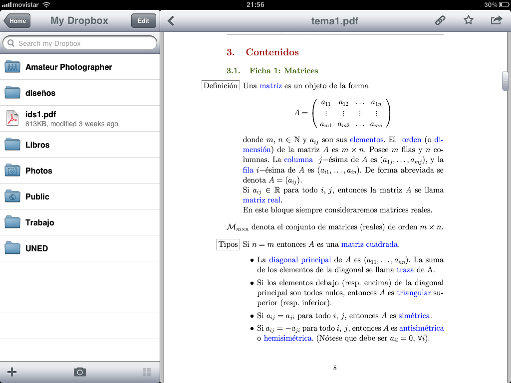 Buena parte de los 2 Gb del espacio disponible los tengo ocupados con una selección bastante amplia, pero siempre cambiante, de libros técnicos en formato PDF. Mi biblioteca de consulta, siempre disponible. Ahí están y puedo consultarlos desde cualquier sitio. Incluso, si tengo ganas y oportunidad, los leo en el iPad descargándolos desde Dropbox. De hecho, para PDF’s esta es la forma en que transfiero los archivos al iPad. Pero de esto hablaré en una próxima entrada.