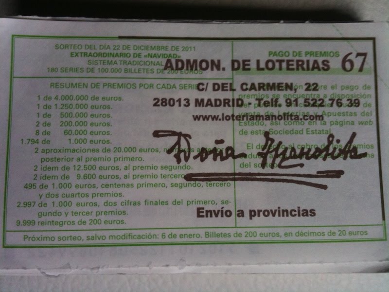 Hoy domingo, que abre todo en Madrid, he pasado —aprovechando que además está mi mujer por aquí este fin de semana y nos dábamos un paseo— por Puerta del Sol para comprar en Doña Manolita, administración de Lotería conocidísima en todo el territorio, para ejecutar un recado que me encomendaron. Obviamente algo pillé para mí. Y más obviamente aún, no voy a poner el número para que nadie lo conozca. No es de extrañar que siempre toque algo ahí, si la mitad de España compra en ese establecimiento, de aspecto bastante cutre, y la otra mitad en Las brujas de oro, con demostraciones de ostentación excesivas para mi gusto (visitamos esa administración en las vacaciones por Pirineos del año pasado).